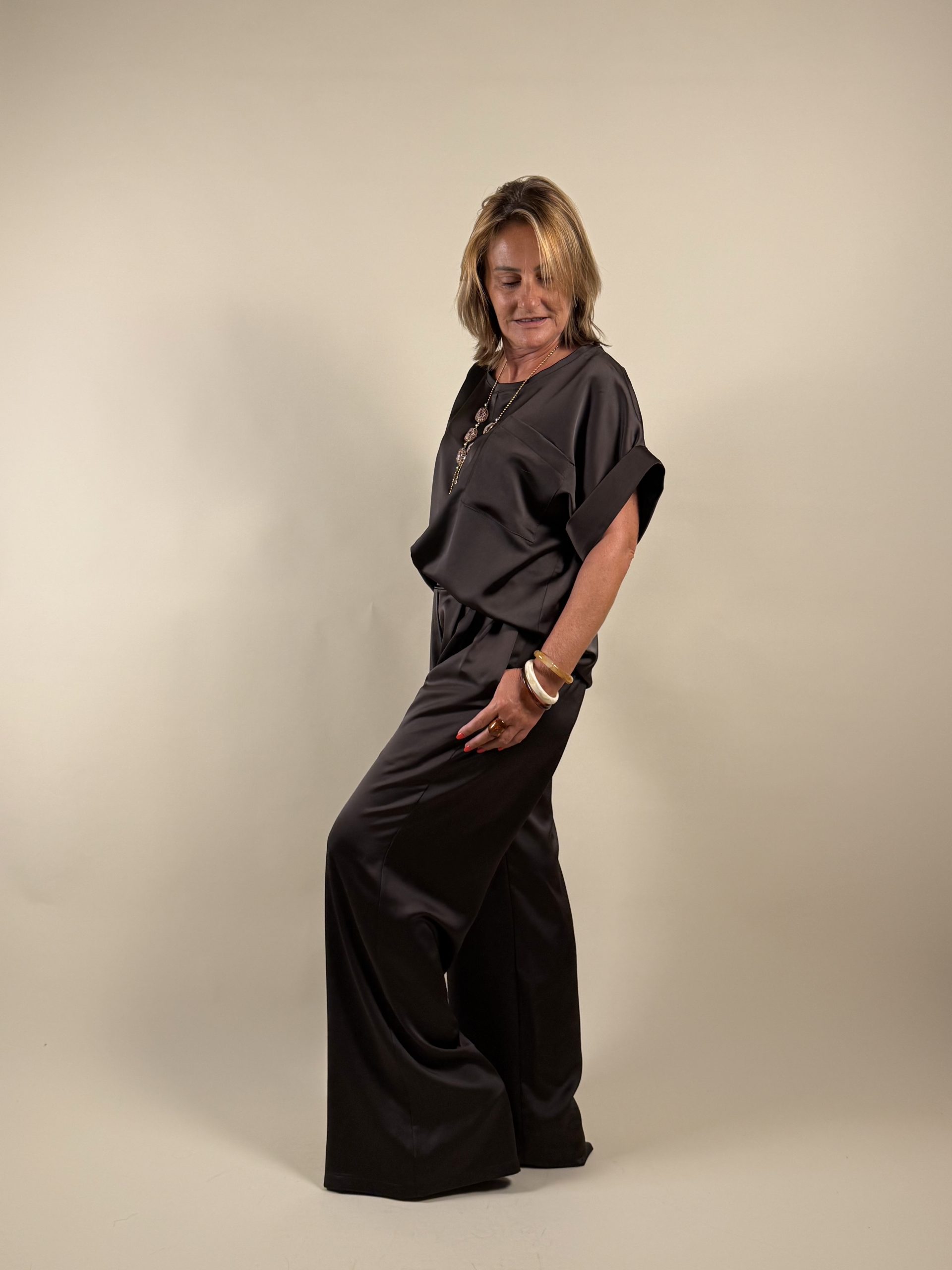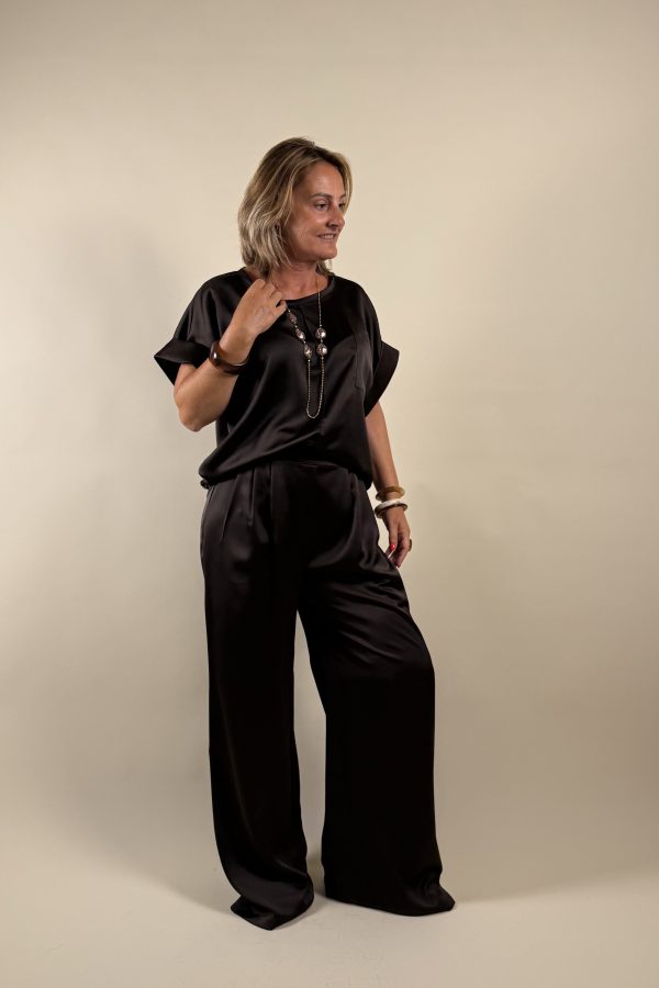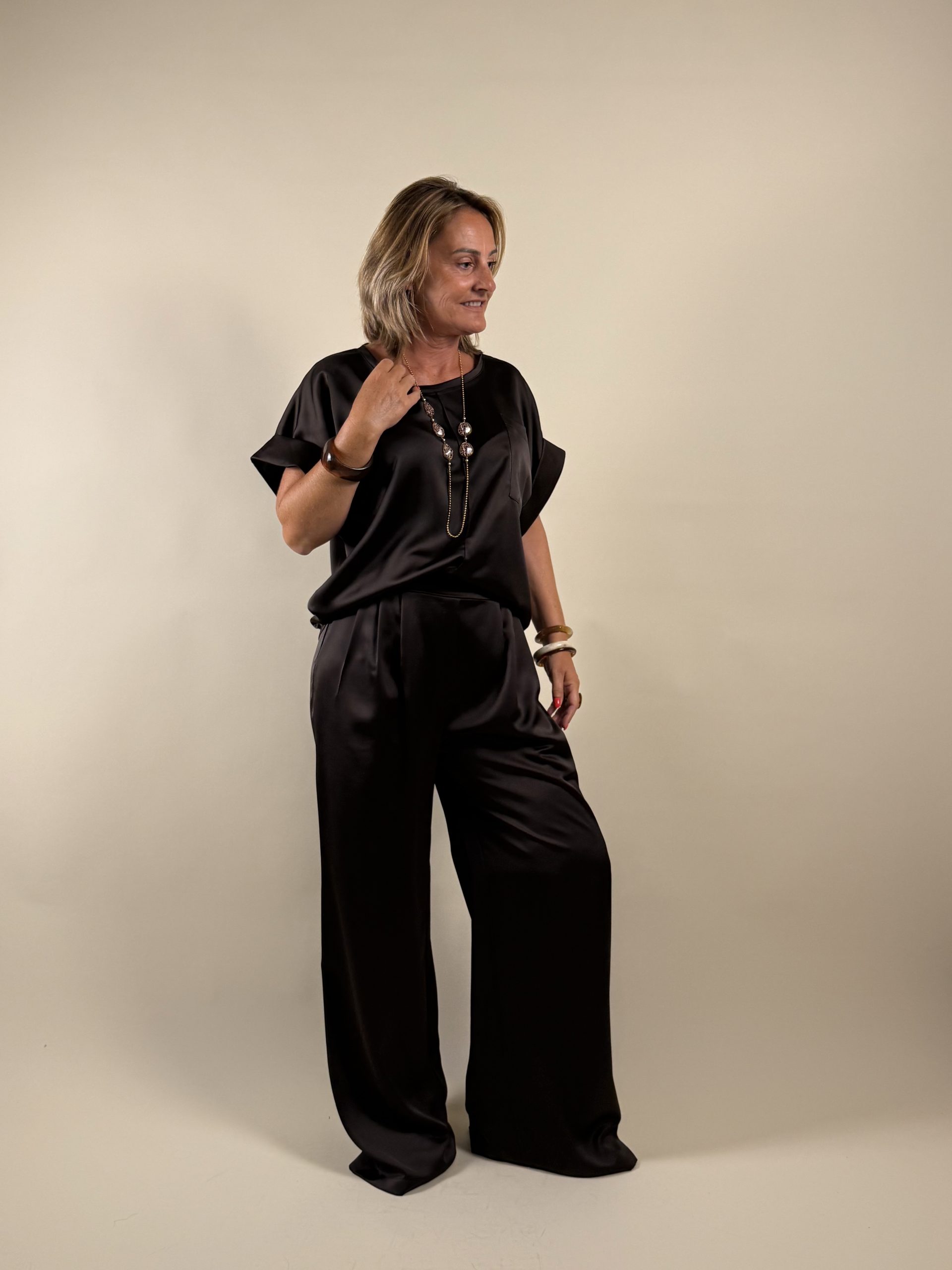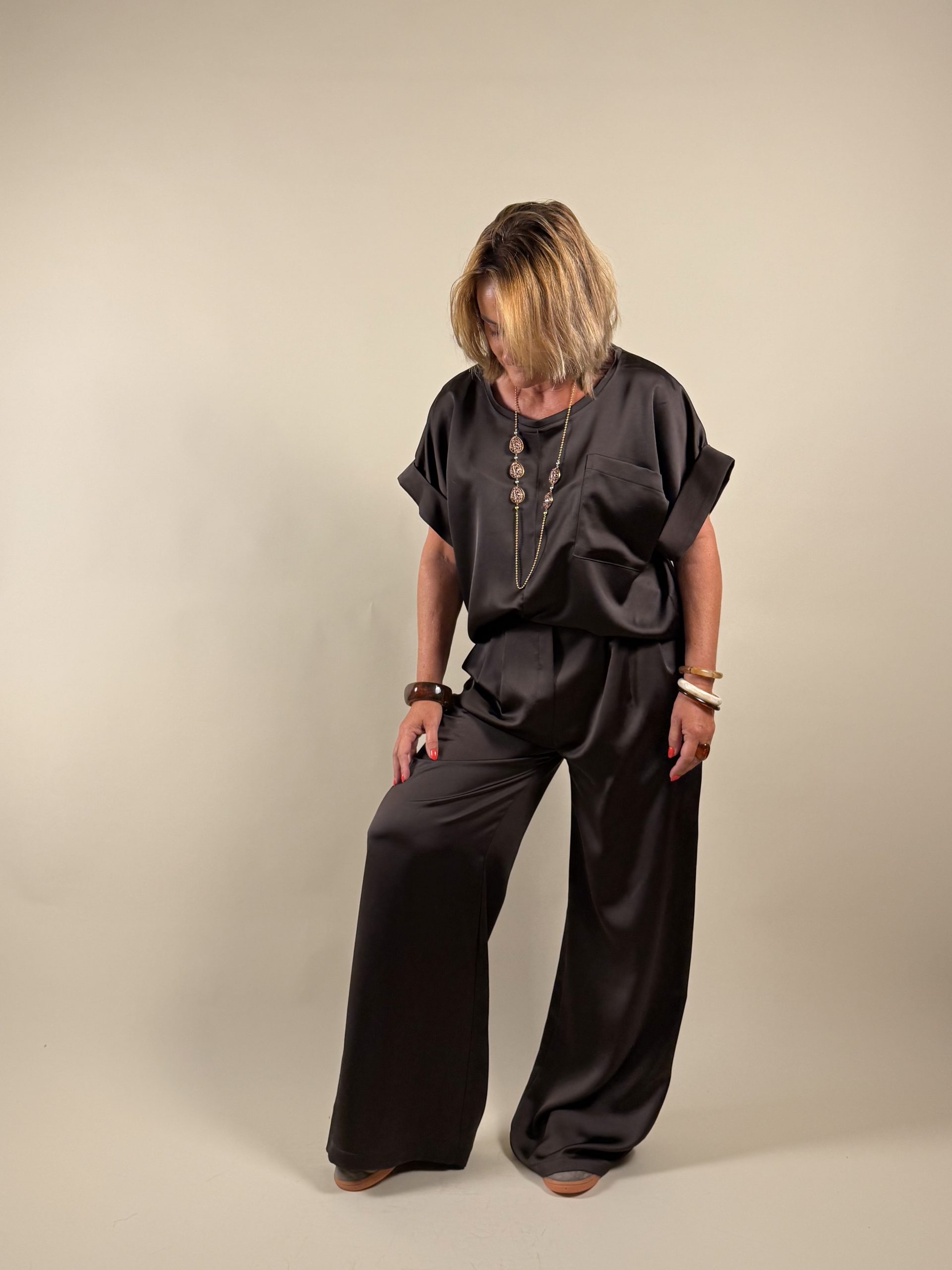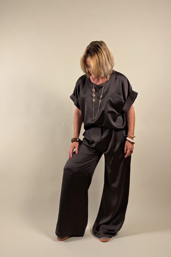 The Ambre pants feature a deep chocolate brown shade with a satin finish that adds subtle shine. Their wide pleated cut creates a chic and comfortable flow.
