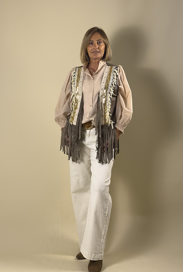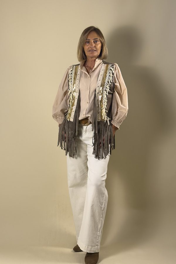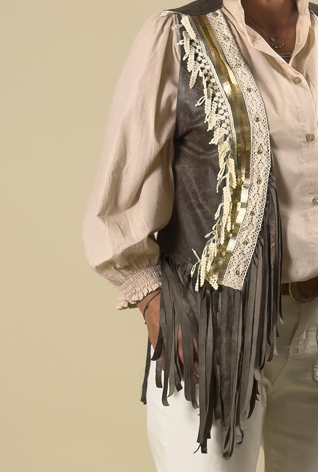 The “Apache” vest is a statement piece with a boho-folk style, blending warm brown tones with shimmery golden threads and delicate embroidery. Its flowing cut and fringed hem add movement and character. Perfect for adding a chic, artisanal touch to your everyday or evening outfits.