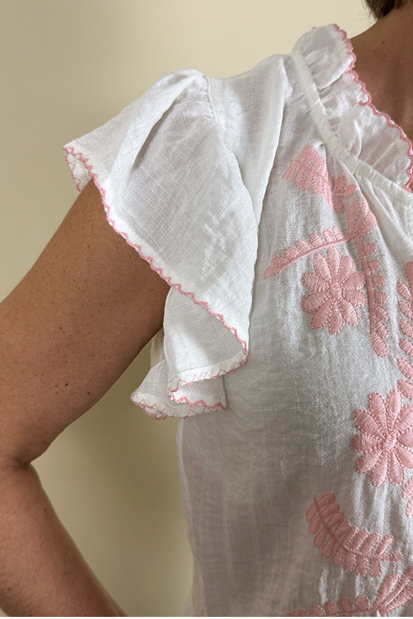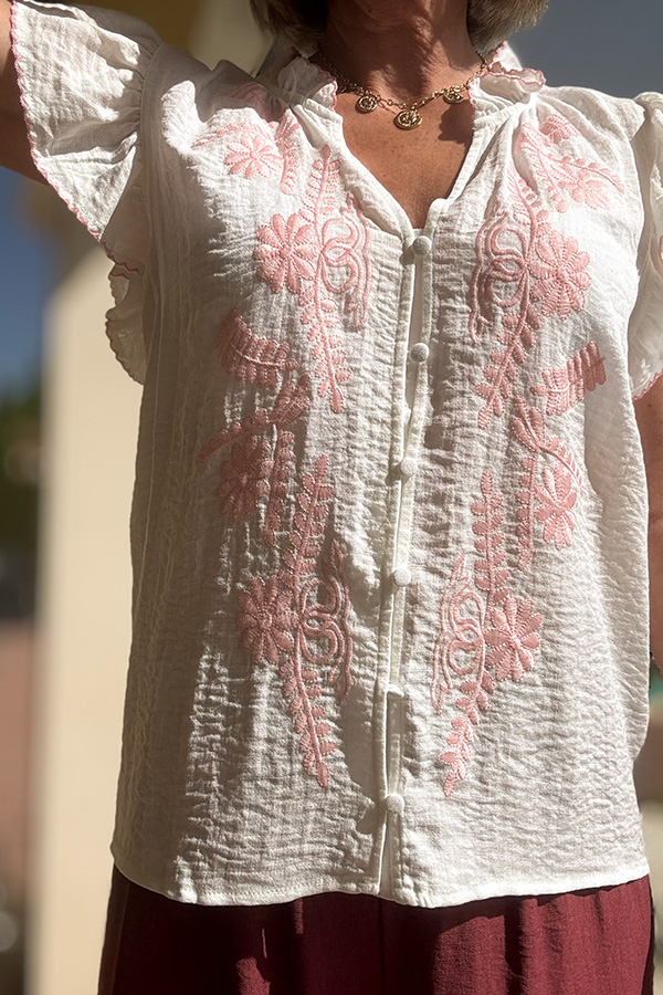 The “Majoé” blouse embodies natural elegance with its 100% linen fabric, light and breathable. Its bright white is subtly enhanced by a delicate pink embroidery, while the ruffled collar and sleeves add a romantic touch. Closed with small round buttons, it pairs beautifully with jeans, a flowy skirt, or linen shorts. A soft, poetic, and timeless piece.