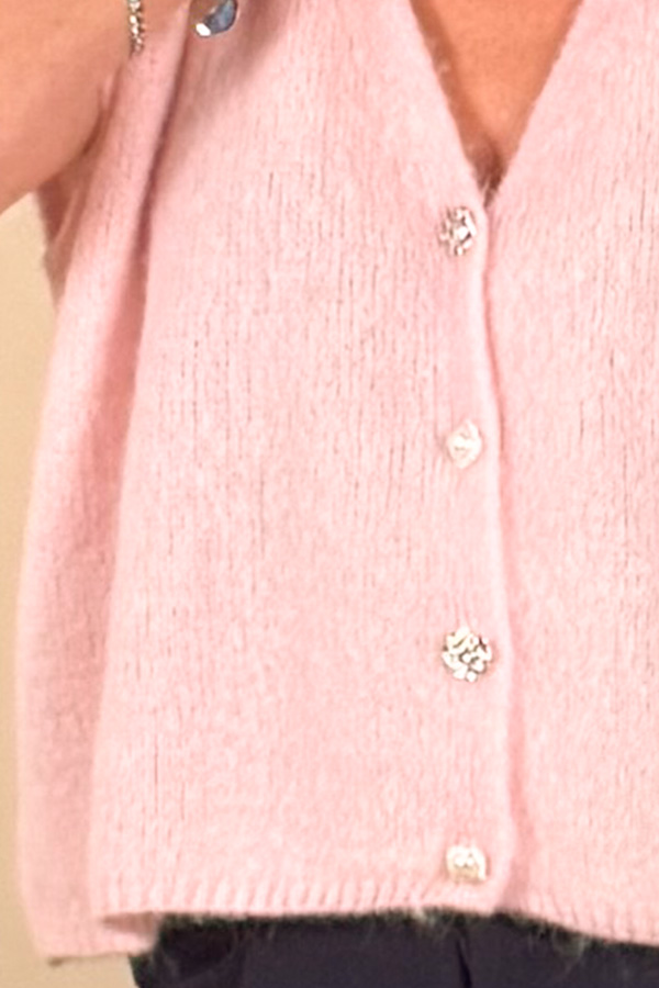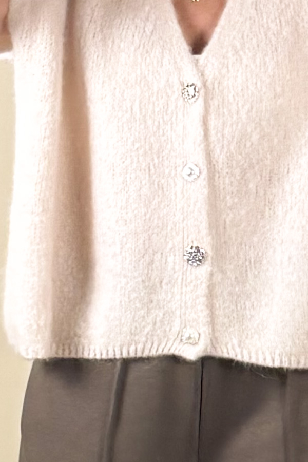 Its deep V-neckline beautifully enhances the neckline, while pearl and silver-toned buttons bring a delicate, luxurious detail.