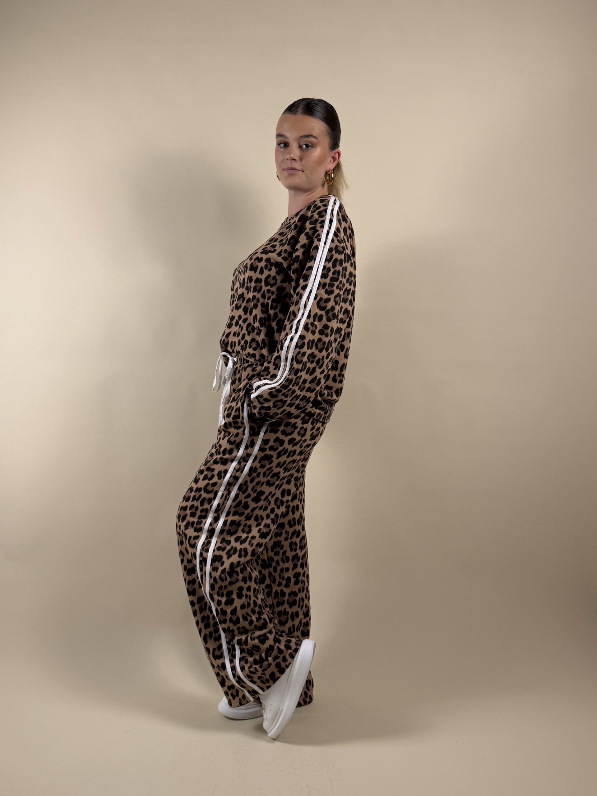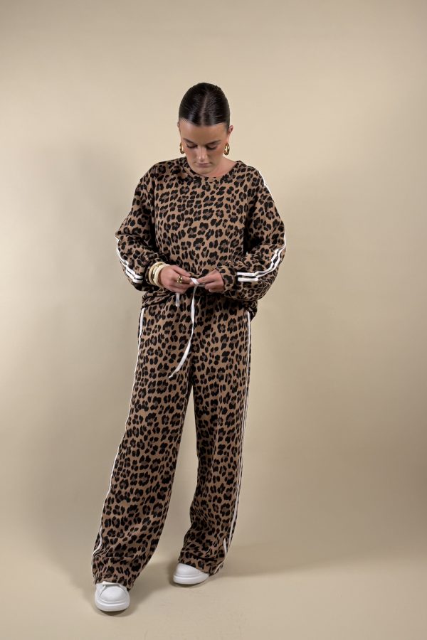 The Morgane set blends comfort and style with its leopard jogger and matching sweatshirt. White side stripes bring a sporty and modern vibe to the outfit.