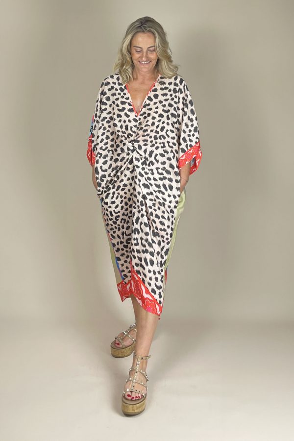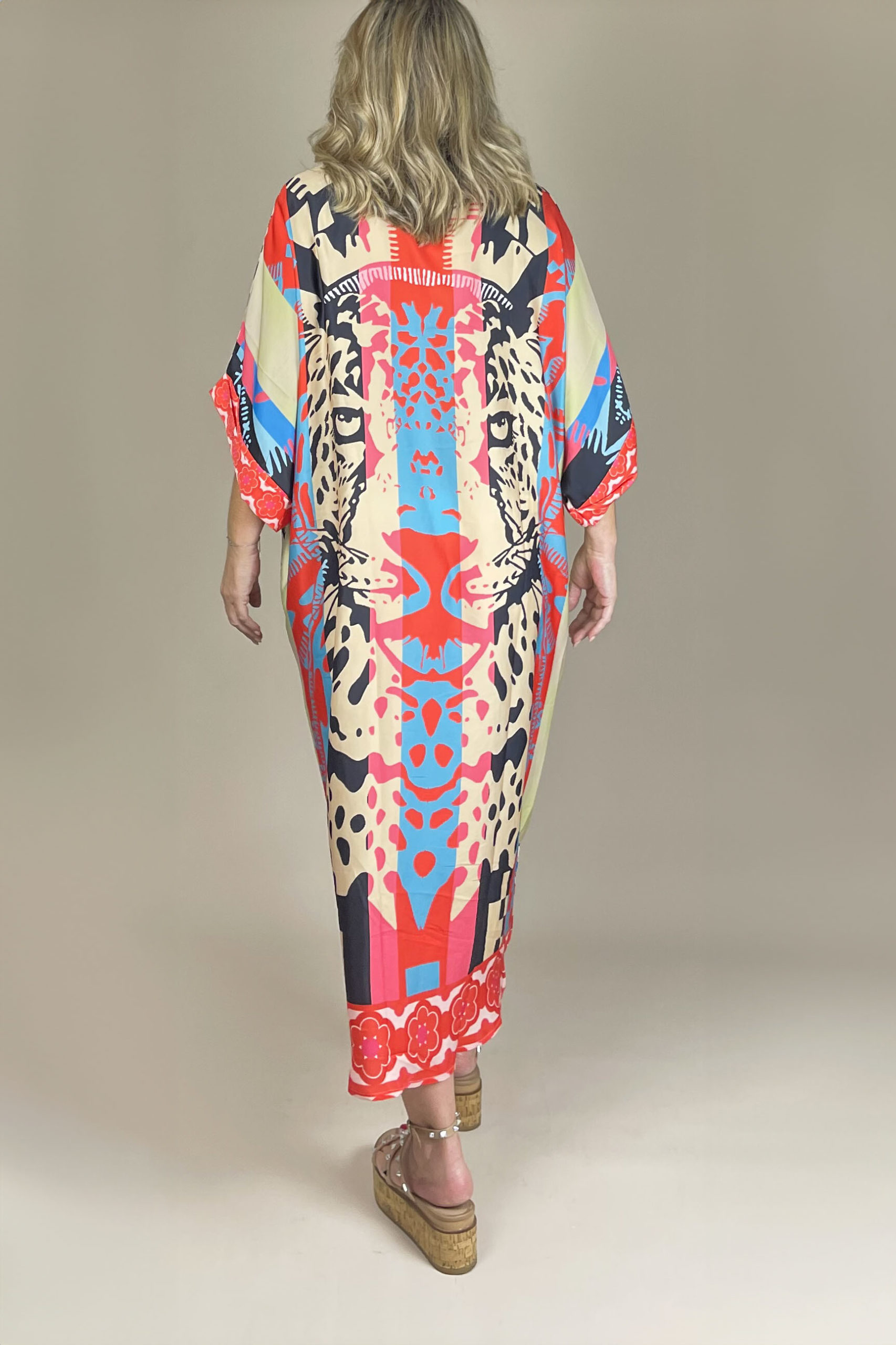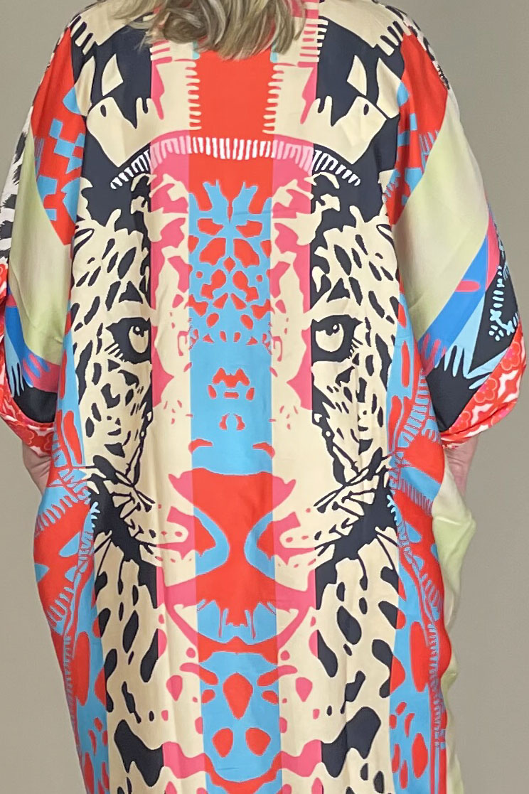 Long flowy dress with a tiger motif on the back, gathered at the front.