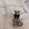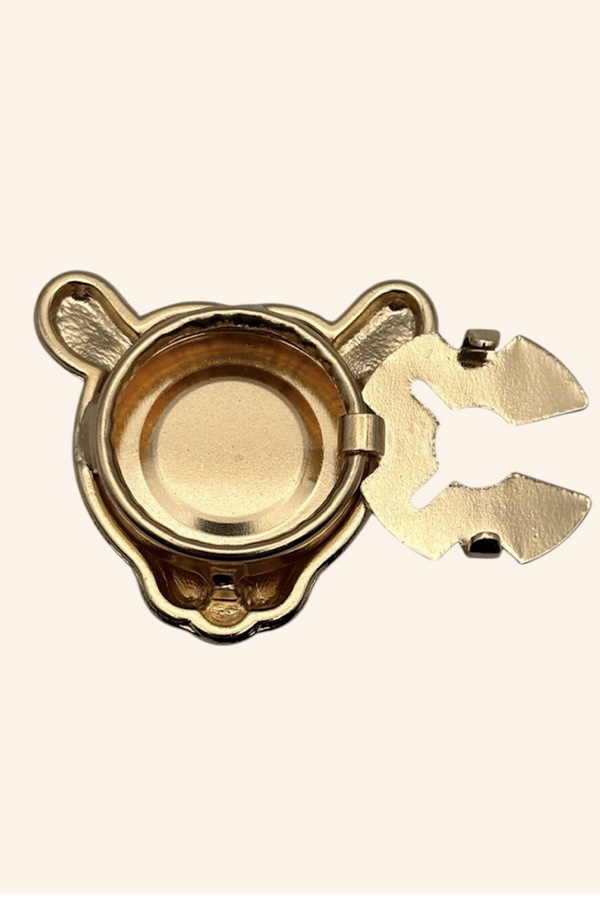 Le métal doré structure les lignes avec précision, tandis que l’émail ocre dessine les motifs avec subtilité. Les yeux, délicatement soulignés de strass, apportent une intensité maîtrisée, sans jamais en faire trop.