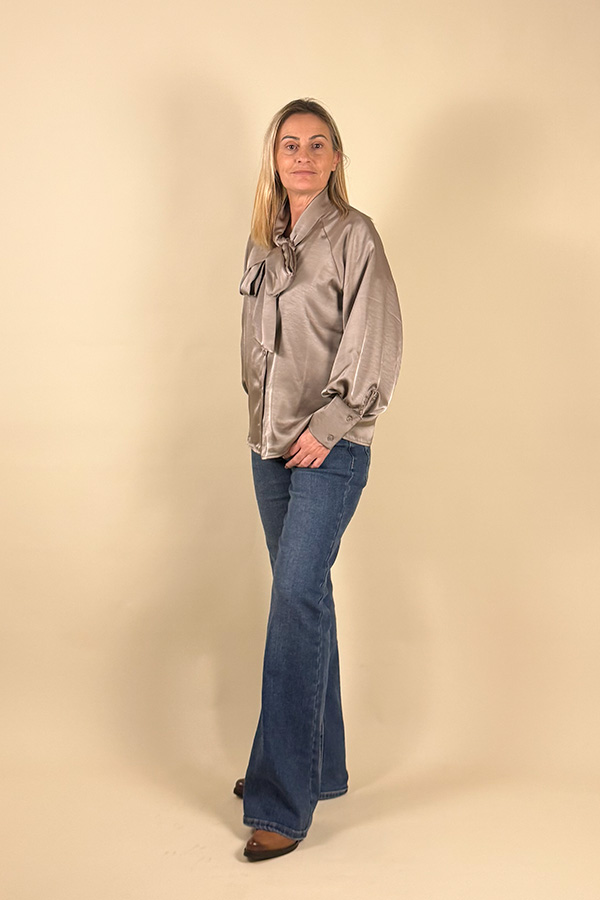 La blouse « Shona » est une pièce raffinée confectionnée en satin taupe, une matière fluide et soyeuse qui capte la lumière avec subtilité. Elle allie confort et élégance, idéale pour toutes les occasions.