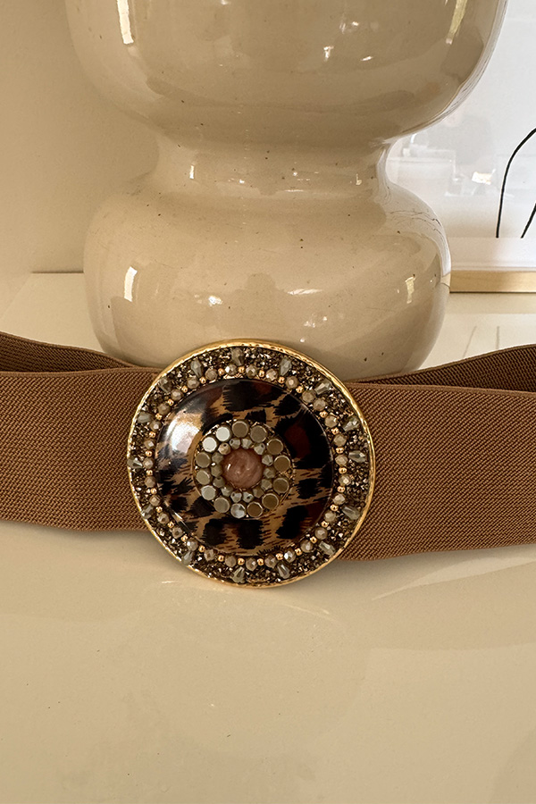 La ceinture « Capucine » est la touche finale idéale pour structurer une tenue avec style et originalité. Son motif léopard audacieux et sa boucle ronde ornée de perles apportent une élégance subtile et tendance, tandis que sa large bande élastique marron assure un ajustement parfait et un confort absolu. Son fermoir à accroche discret permet un maintien sûr tout en sublimant la silhouette.