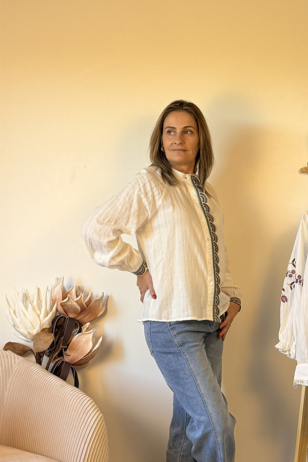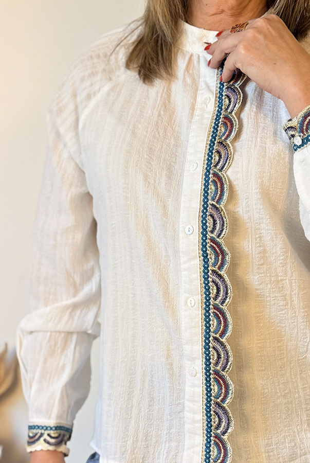 La chemise Bianca séduit par son style délicat et ses finitions décoratives colorées qui soulignent le devant et les poignets avec élégance.