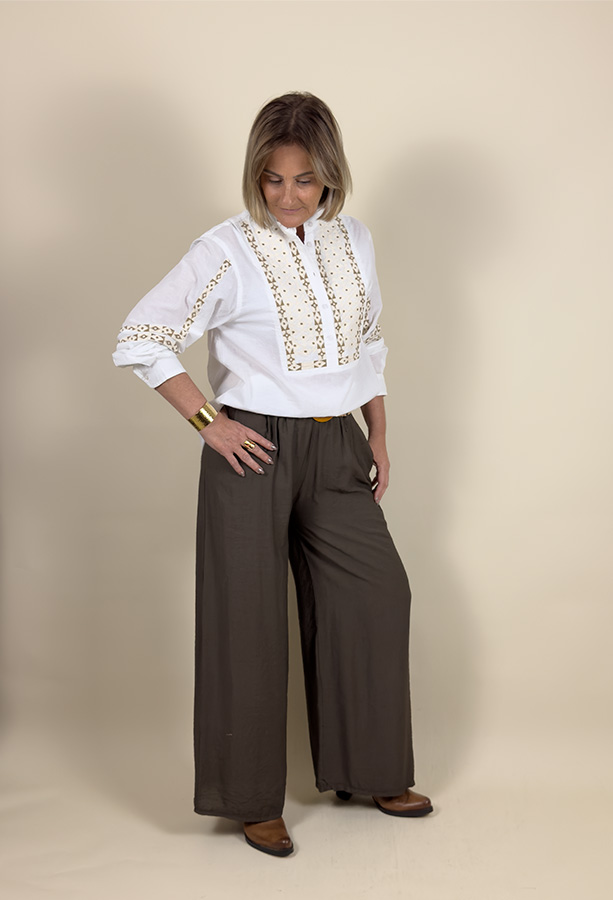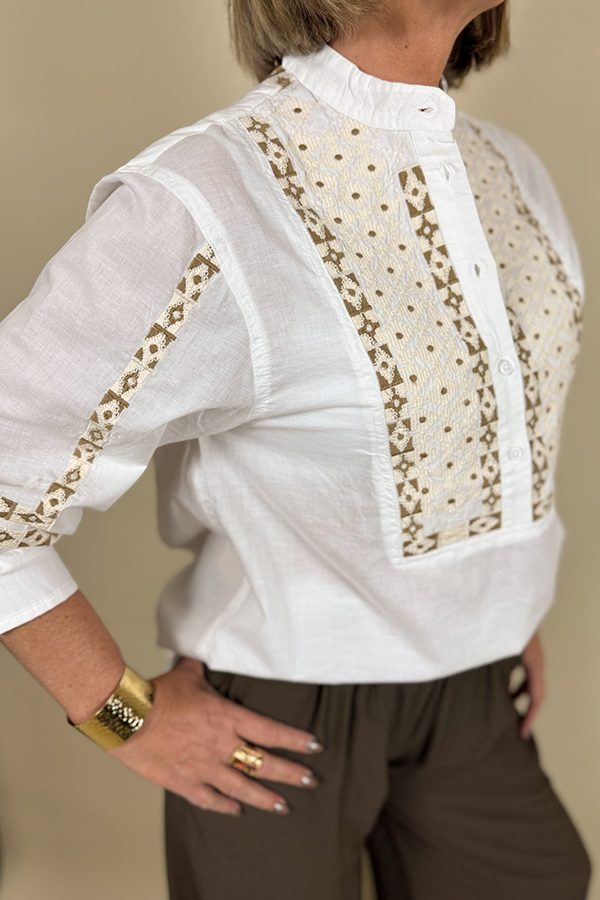 La chemise « Lianaé » séduit par son allure authentique et raffinée. Confectionnée en coton blanc léger, elle est sublimée par de broderies délicates dans des tons marron et beige, positionnées sur le devant et les manches. Son petit col montant lui donne une touche chic et structurée, idéale pour les amoureuses du style bohème élégant.