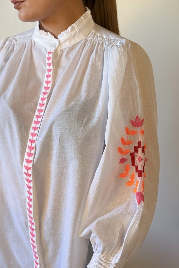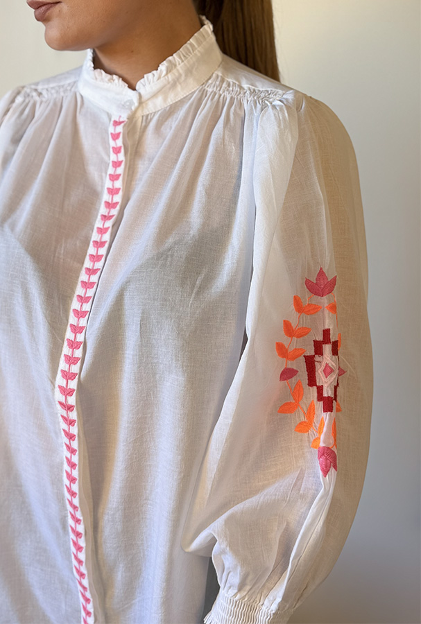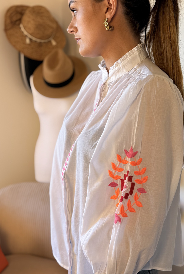 Les broderies colorées sur les manches et les délicates finitions au niveau du plastron ajoutent une touche artisanale et élégante.