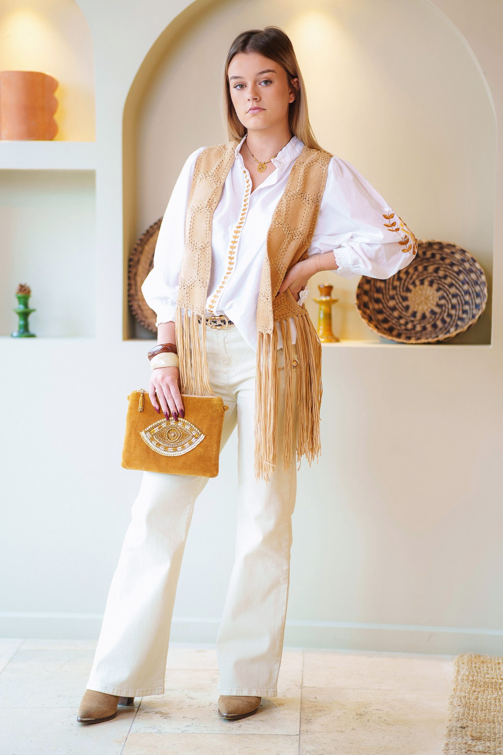 Le jean « Johanna » revisite le denim classique avec une touche de sophistication. Sa coupe flare allonge la silhouette, tandis que ses poches ornées de boutons dorés apportent un éclat raffiné et discret. Dans un beige doux et lumineux, il s’associe facilement à toutes vos tenues, du look casual chic au style plus habillé.