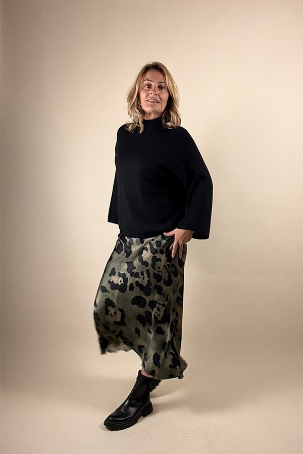 La jupe « Loriane » allie l’audace du motif léopard kaki à l’élégance d’un effet soie fluide. Sa longueur midi/longue et sa ceinture élastique en font une pièce confortable et flatteuse pour toutes les morphologies. Elle apporte une touche sauvage mais raffinée à vos tenues, parfaite aussi bien en journée qu’en soirée.