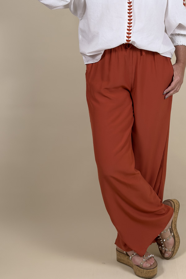 Le pantalon « Lorna » est la pièce parfaite pour allier confort et allure. Sa matière fluide et soyeuse offre un tombé impeccable, tandis que sa coupe droite élance la silhouette avec naturel. En terracotta chaud, il apporte une touche de couleur subtile et tendance. Sa taille élastique avec cordon assure un ajustement confortable tout au long de la journée.