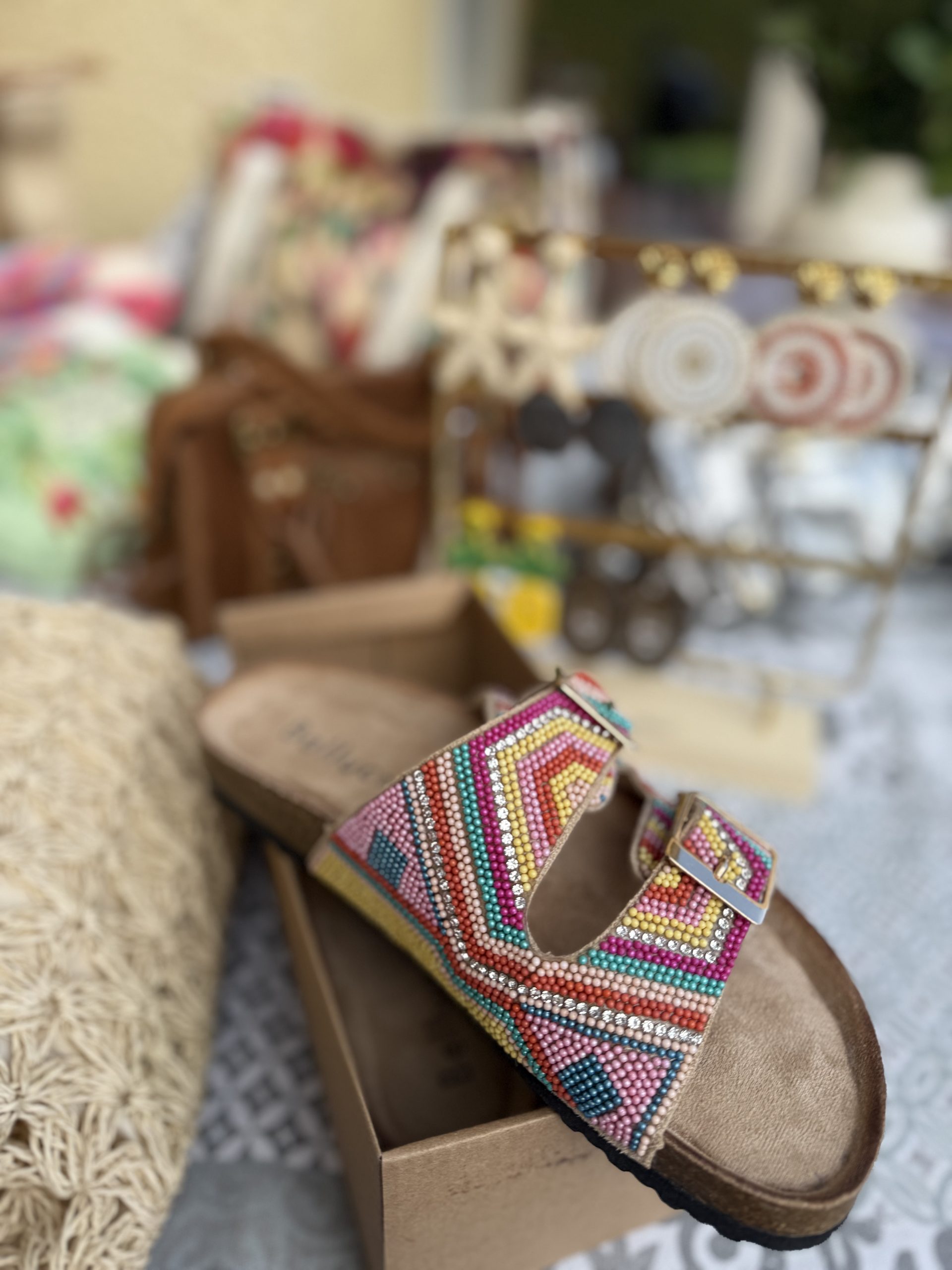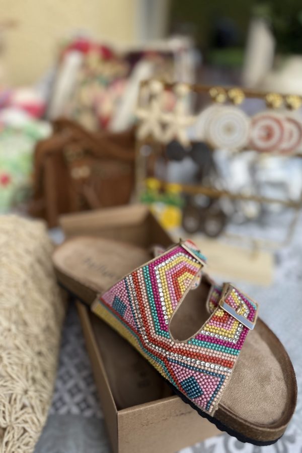Les sandales « Cannes » sont faites pour celles qui veulent allier confort et touche de fantaisie. Ornées de perles multicolores, elles apportent une dose de bonne humeur à vos tenues estivales. Leur semelle épaisse et moelleuse garantit un confort optimal, tandis que les deux boucles argentées sur le dessus assurent un bon maintien tout en ajoutant une touche de brillance.