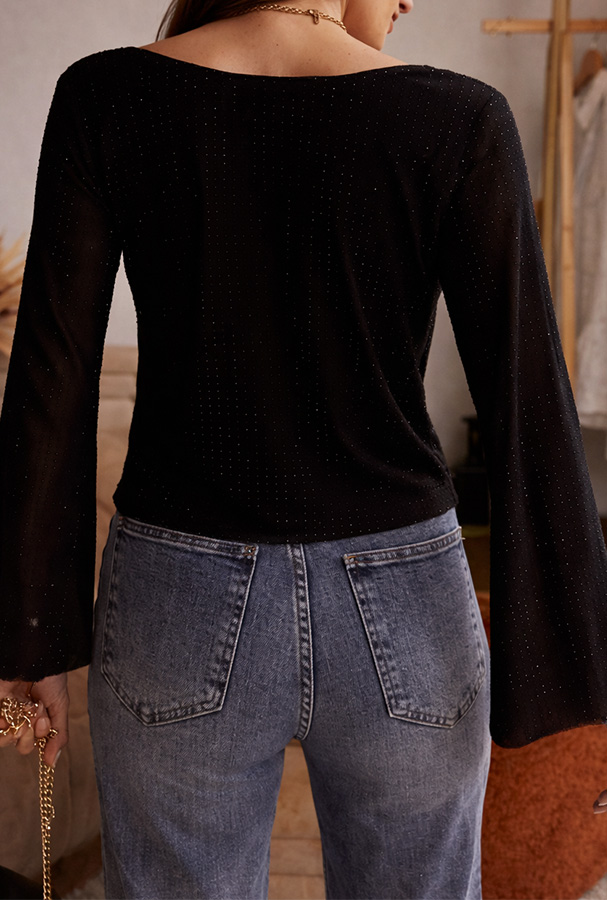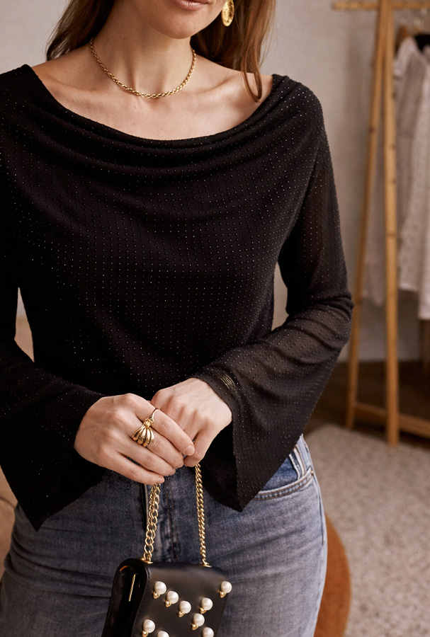 L’encolure délicatement dégagée met en valeur le port de tête tandis que les manches longues légèrement évasées apportent une touche féminine et élégante.