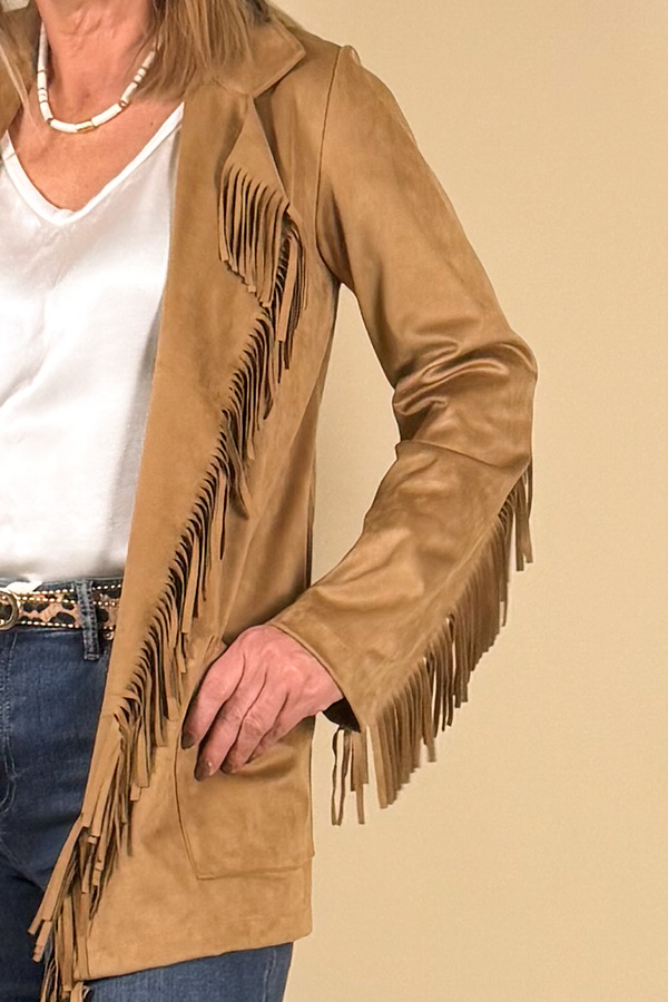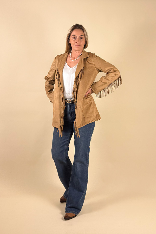 Cette veste incarne le style bohème et western avec élégance. Confectionnée en daim marron, elle séduit par sa texture douce et authentique.